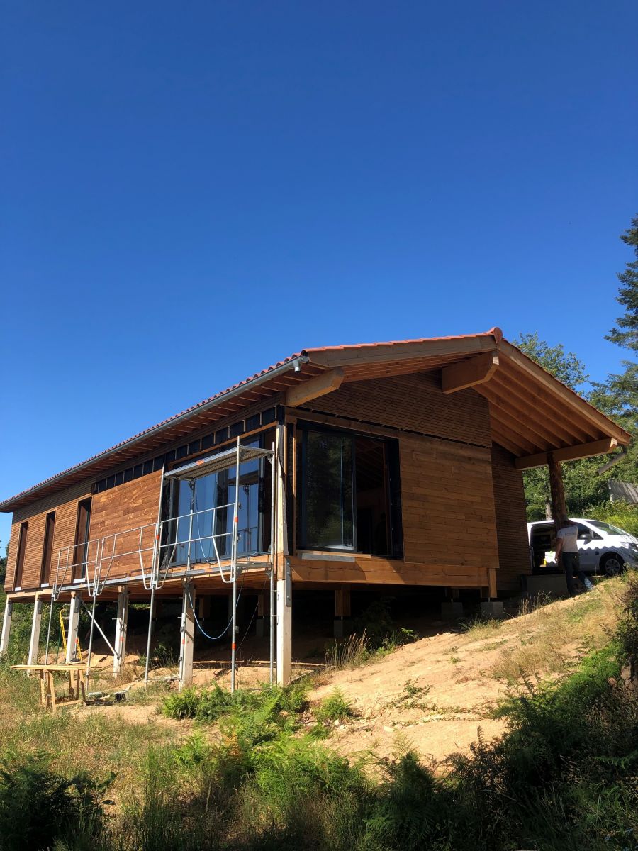 Cette maison ossature bois de 140 m², construite dans la pente, est presque exclusivement réalisée en bois local.