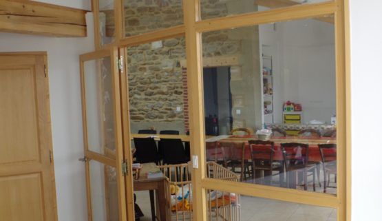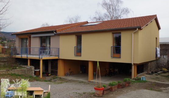 Le plancher intermédiaire ainsi que les façades sud et est sont en ossature bois. Le sapin de la Loire a été utilisé pour la structure. Une mezzanine en bois rond a été créée dans la grange. Cette réhabilitation a également permis de réaliser une isolation thermique par l’extérieur en laine de bois sur le mur nord. Le bois est également visible à l’intérieur ou l’escalier et les menuiseries des chambres sont en bois.